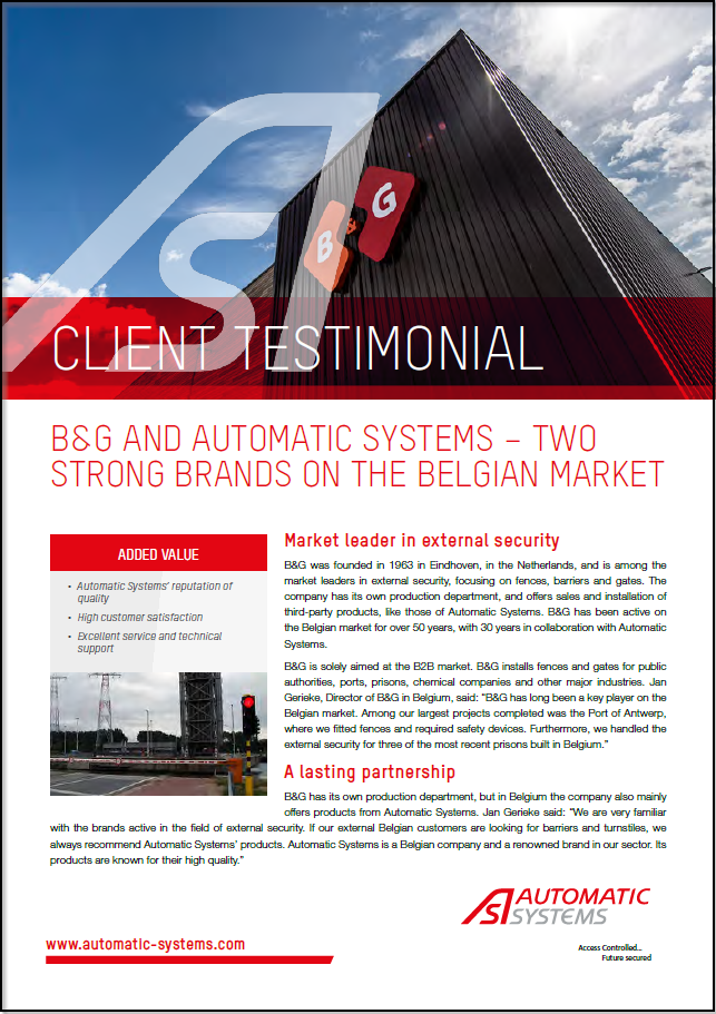 B&G was founded in 1963 in Eindhoven, in the Netherlands, and is among the market leaders in external security, focusing on fences, barriers and gates. The company has its own production department, and offers sales and installation of third-party products, like those of Automatic Systems. B&G has been active on the Belgian market for over 50 years, with 30 years in collaboration with Automatic Systems.