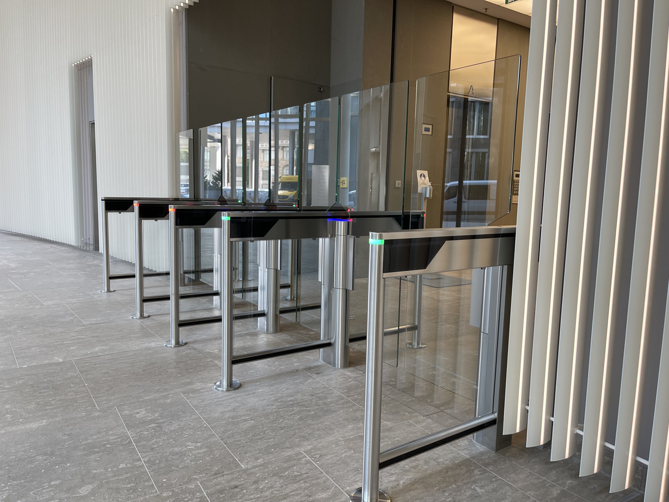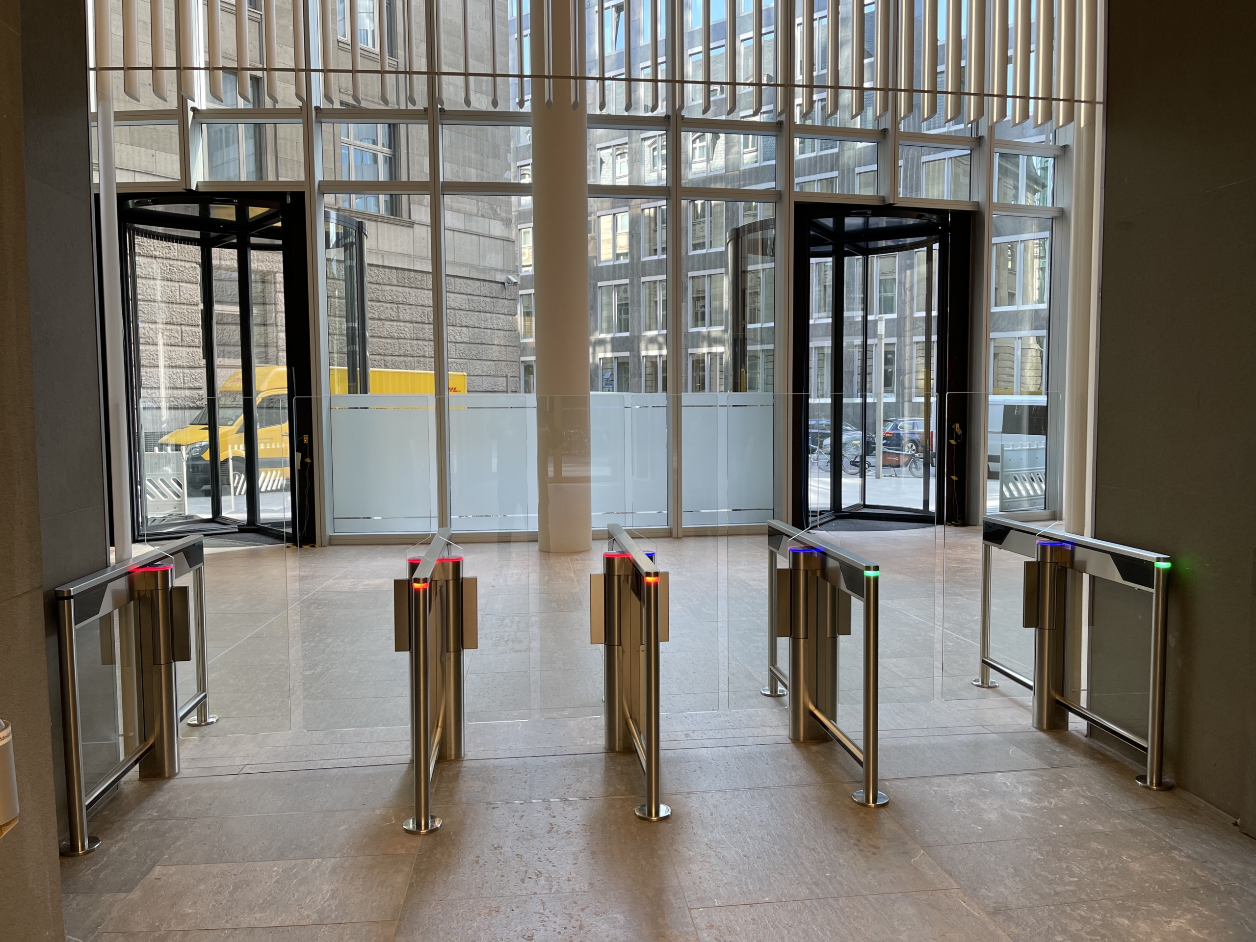 The Skyper building complex in Frankfurt am Main boasts a very special architecture. The three-part complex – consisting of the 153.8-metre Skyper high-rise with 39 floors, the neoclassical Skyper Villa from 1915 and the Skyper Carrée – offers a total of 53,900 m2 of office space for numerous companies and banks. When the existing single access entry systems were dismantled in the summer of 2020 as part of renovation work on the foyer, the owner opted for a new, modern solution that would blend in perfectly with the architecture of the skyscraper. Every day, large numbers of people go the foyer to get to their workplace. Numerous visitors also pass through this area. This called for a solution combining functionality, safety and an appealing design.