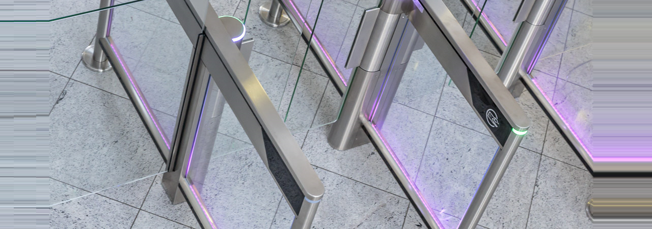 - Zijpanelen in helder gehard glas met verbeterde elektronische beveiliging voor gemakkelijke doorgang, zelfs met bagage of koffers met wielen.